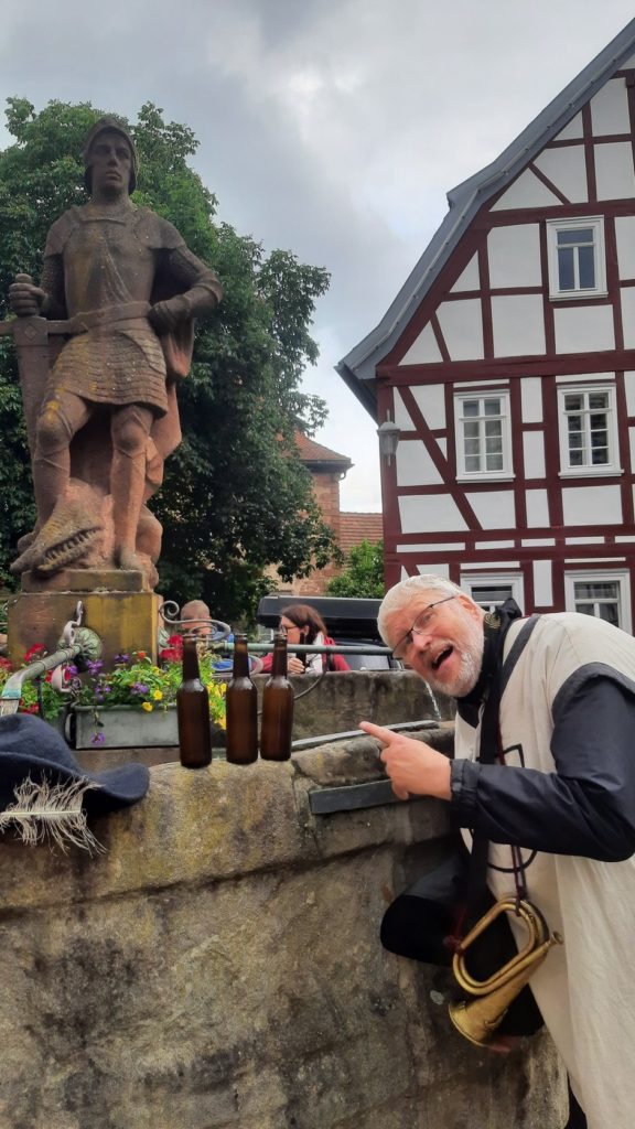 Eine Treppe hoch und am Hinterturm vorbei, nahm uns der Stadt- und Nachtwächter Hagen in Empfang. Er war nicht nur wie ein Stadt- und Nachtwächter gekleidet, er hatte auch Horn und Schwert dabei. Ungewöhnlich war aber der Gürtel, in den hochprozentige große Flaschen gesteckt wurden.