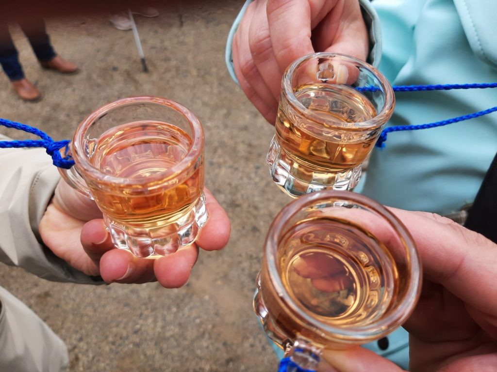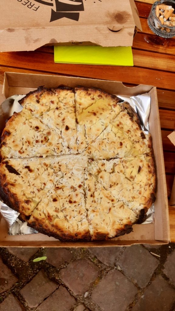 Gegen 18 Uhr gab es dann mal was zu Essen. Eine Art Salzekuchen. War nur leider recht wenig für die Gruppe, so dass nicht überall genug Essen ankam. Und bei dem vielen Alkohol war Essen wichtig.